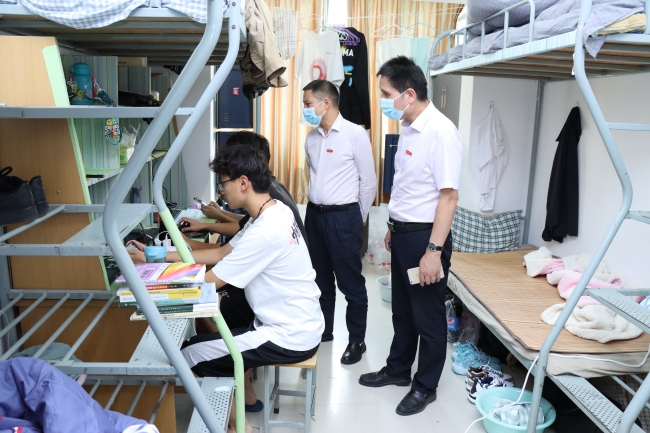 为全面了解疫情防控期间我校教学工作开展情况,切实强化教风建设,确保线上教学效果,9月22日下午,校长王能民等校领导深入学生宿舍开展教学检查活动,全面了解新生返校后线上开课首日教学准备、教学运行情况,并对学生疫情期间学习生活情况进行调研,切实提升育人成效。