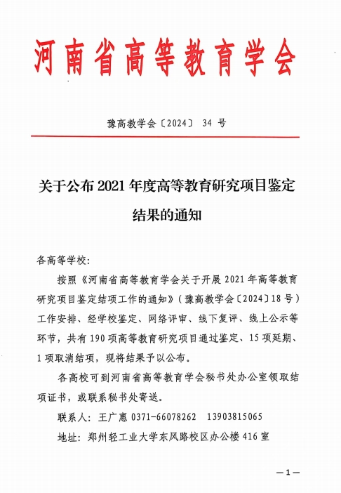 近日,河南省高等教育学会下发了《关于公布2021年度高等教育研究项目鉴定结果的通知》(豫高教学会〔2024〕34号),我校主持的2个项目顺利通过鉴定。