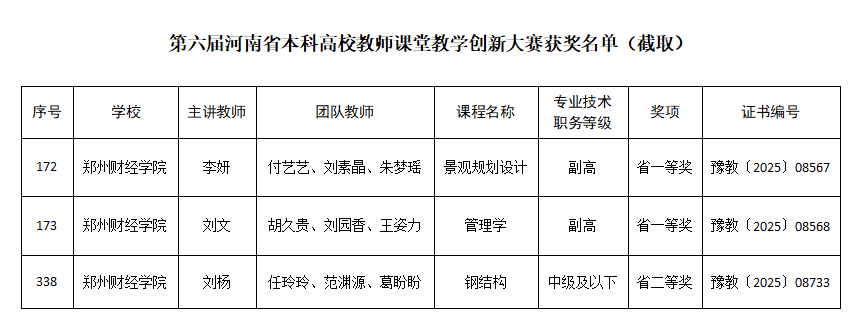 近日,河南省教育厅下发《关于公布第六届河南省本科高校教师课堂教学创新大赛获奖名单的通知》(教高〔2025〕131号),我校艺术设计学院李妍副教授团队、管理学院刘文副教授团队获得一等奖,土木工程学院刘杨教师团队获得二等奖。
