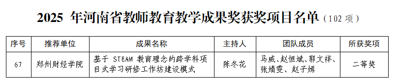近日,河南省教育厅下发《关于公布2025年河南省教师教育教学成果奖获奖项目的通知》(教师〔2025〕176号),正式公布了2025年河南省教师教育教学成果奖获奖名单。我校教育学院陈冬花院长主持的《基于STEAM教育理念的跨学科项目式学习研修工作坊建设模式》项目荣获二等奖。